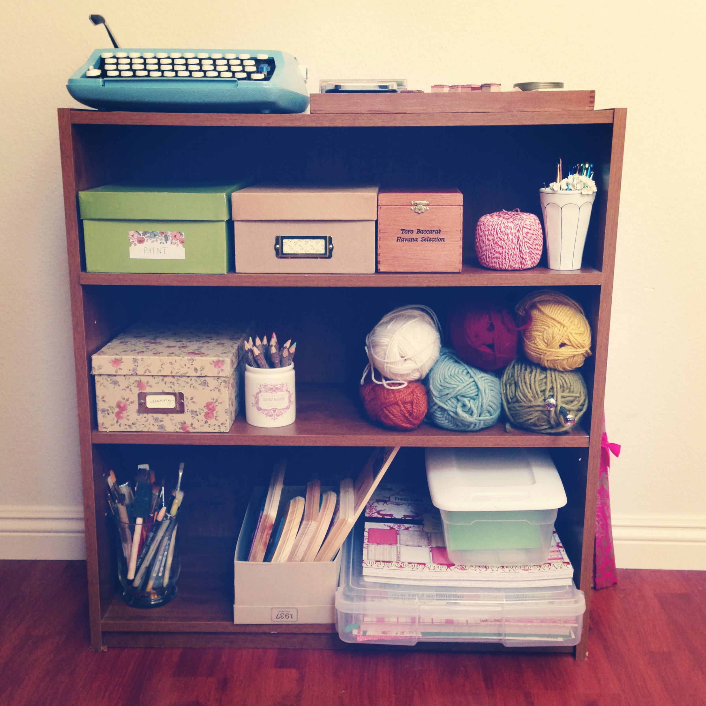 One perpetual source of clutter is my collection of art-ing and crafting supplies. So I commandeered one of my husband’s unused bookshelves (thanks, husband! and also why do you hate books, husband?) and turned it into a ‘making shelf.’ I like to call it ‘making’ instead of ‘crafting’ because it makes me sound less like a frumpy quilter and more like a with-it-cool-person.